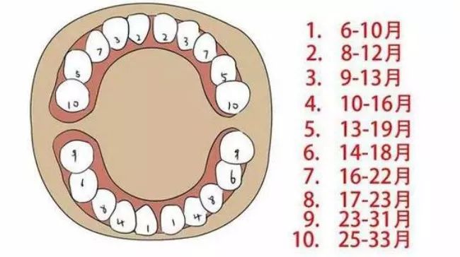除了出牙时间,出牙顺序也是有规律的。大多数宝宝会按照一定顺序,一个一个地长出乳牙。具体出牙顺序,见下图。