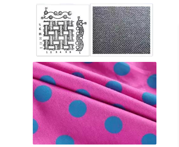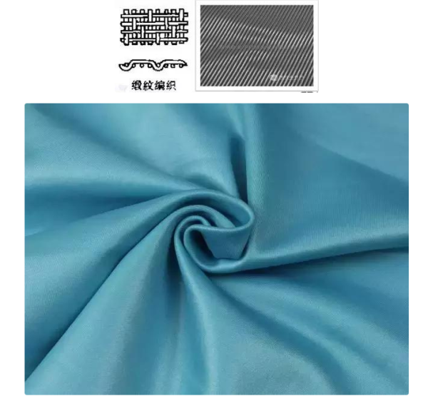 斜纹:经纱和纬纱至少隔两根纱才交织一次。斜纹面料比较好辨认,因为斜纹面料经线和纬线的交织点在织物表面呈现一定角度的斜纹线的结构形式。它的特点是有正反面之分,交织点较少,浮线较长,手感松软,密度较高,产品比较厚实,组织立体感较强。
