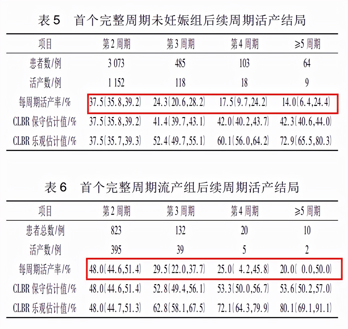 4、每个完整周期活产率均随周期数的递增而降低,未妊娠组由 37.5%由48%降低至20% ,各周期活产率差异均有统计学意义。各组 CLBR保守及乐观估计值逐步递增,CLBR保守估计在3个完整周期后趋于稳定。