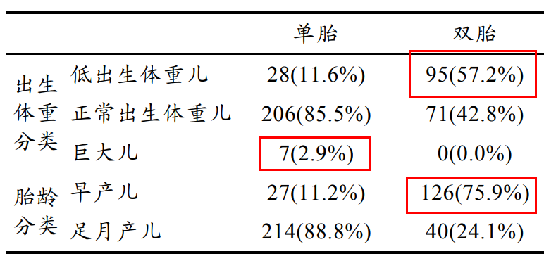 多胎组低体重儿及早产儿出生率远高于单胎组