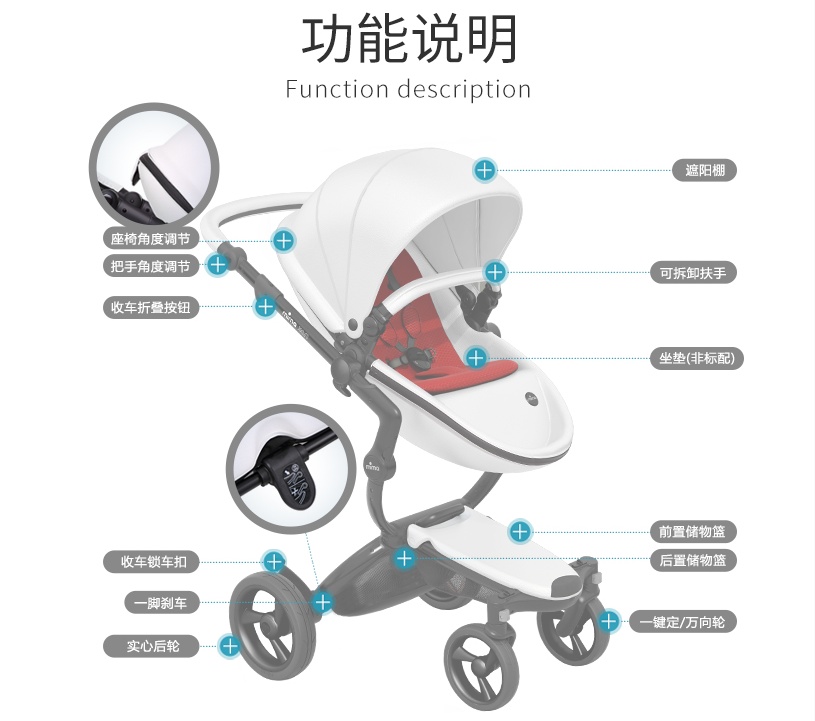配色简单大方,发泡轮胎不用充气,方便。车子很轻很灵活,颜色搭配高级感非常足,五点式安全带,睡篮秒变坐兜,非常方便快捷,配了睡篮防风布罩,天气越来越凉快,很快用的上。普通的高景观车中,这款也算比较轻便的了,收折起来占位也比较小,也非常容易操作。可坐可躺,避震效果超级棒,可以双向推车,实用非常。