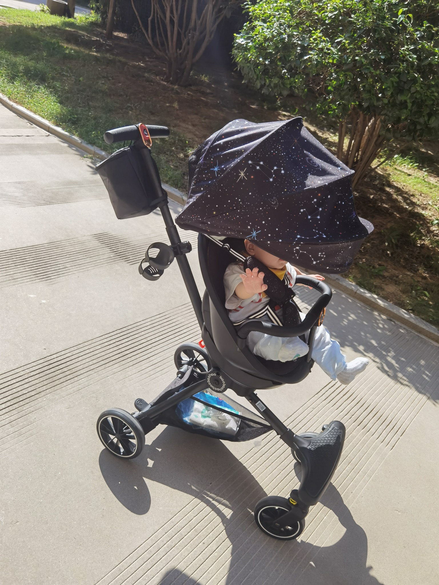 小车外观整洁大方,车子很轻,颜值高,上下楼比较方便。这车特别稳,避震的效果很不错,设计和用料上应该是下了不少功夫,做工细节方面规规矩矩,有点超出预期。看上它主要就是空间是真的大,等冬天穿棉衣服也能坐得下,一键换向是真香,看了其它几个品牌的都没有这个功能,还有就是购物篮很大,出门带东西方便。配置防溜车绳,下坡、或者颠颠路不经意间给足安全感。