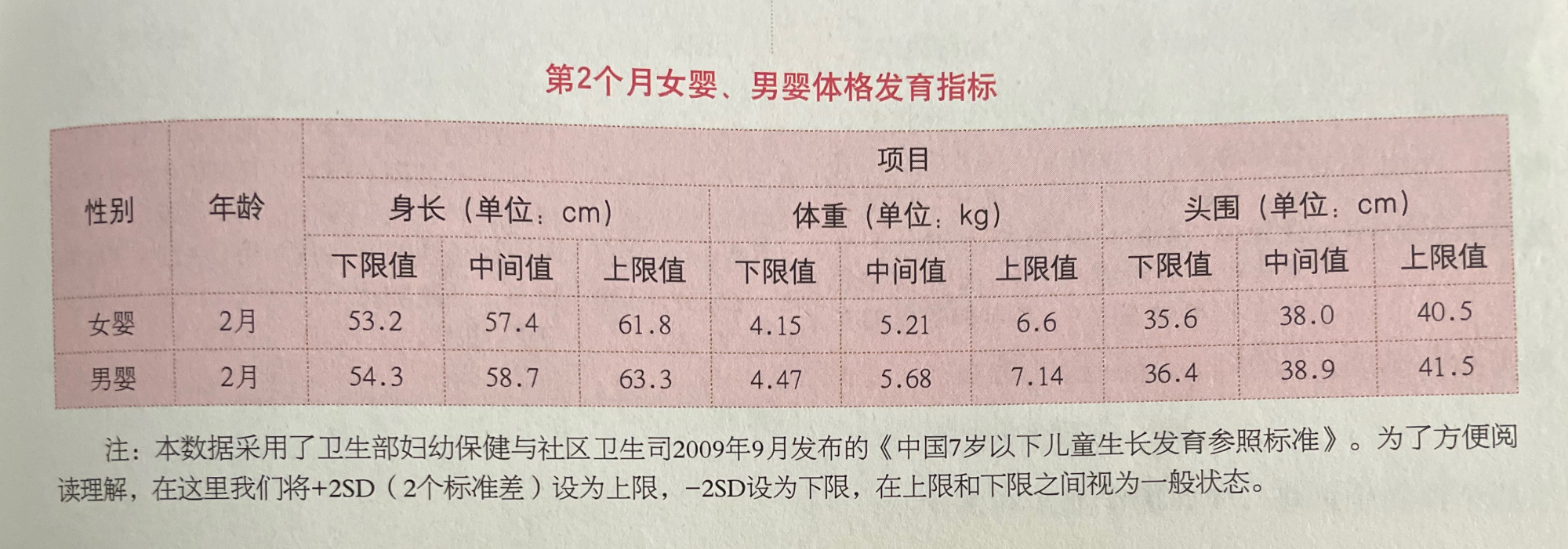 根据《中国7岁以下儿童生长发育参照标准》,可以看到刚出生的足月宝宝、一个月宝宝、两个月宝宝的正常身高、体重、头围的正常范围如下: