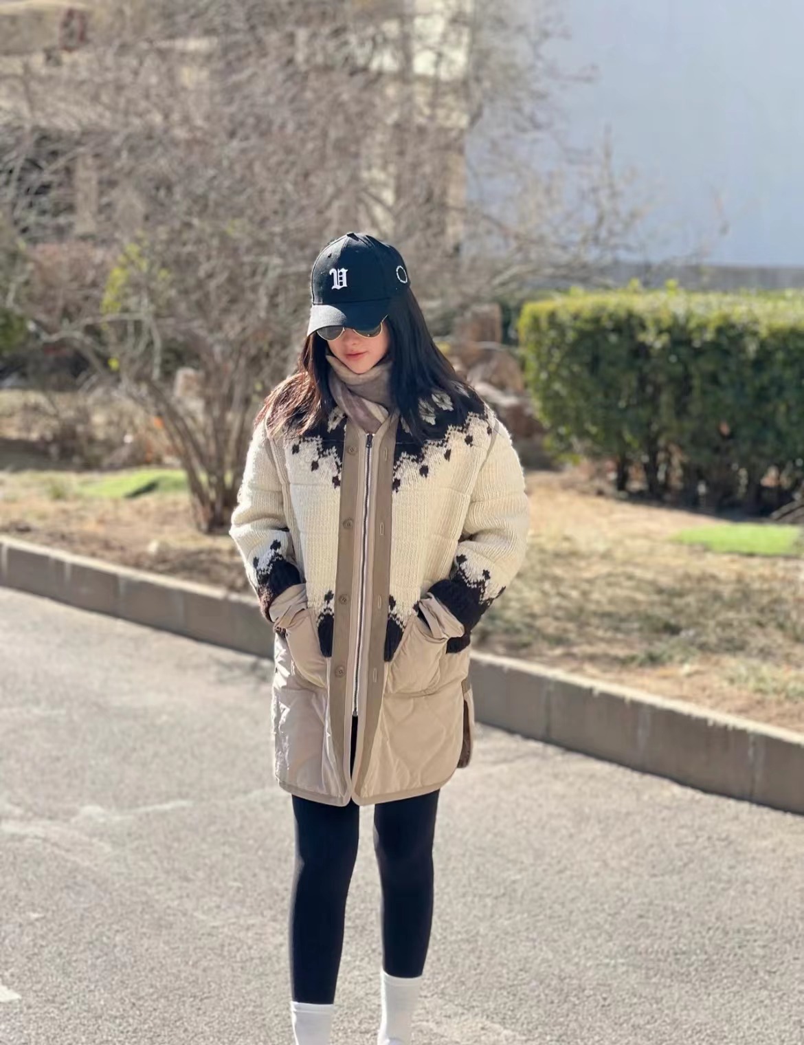 照片中有几张是她自己的照片,她戴着黑色帽子,穿一件撞色外套,整体穿搭尽显时尚,她双手插兜凹造型,脸上泛着甜笑,产后状态特别好!