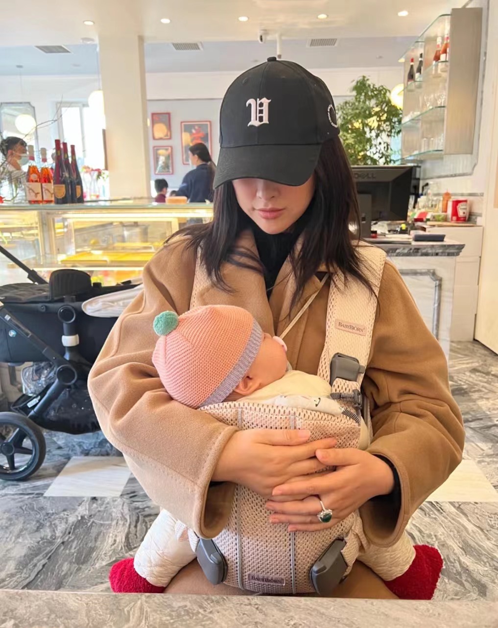 另外一张是 她抱着女儿在餐厅的照片,女儿被她抱在怀里,穿着厚厚的白色棉衣,头上戴着一顶粉色小帽子,小脸肉嘟嘟的,嘴巴里吃着小奶嘴,甜甜的睡着了,奶萌的样子十分可爱!