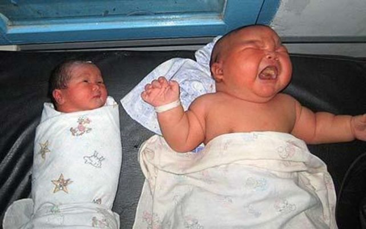 正常婴儿与世界上最大的婴儿对比图,最大的婴儿重达23公斤。