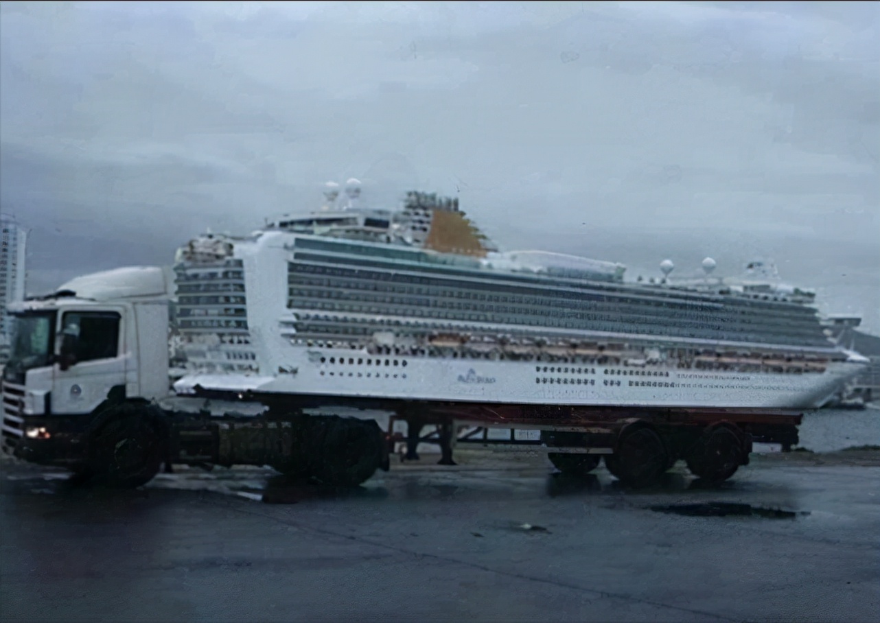 卡车与油轮停放的地方真的是巧合,看上去就像卡车拉着大游轮在路上行驶一样。