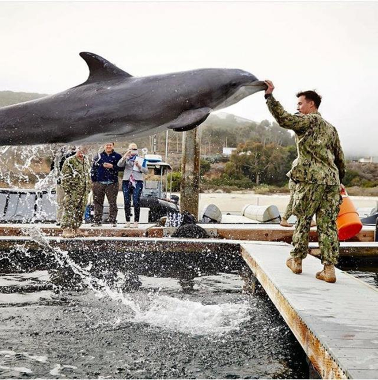 海豚在空中起来的瞬间,与喂食员的手重合, 静静地等待投喂,这个画面温馨而美好。