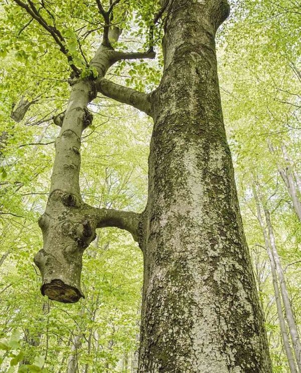 树的底部不知道什么原因被砍掉了,但是依靠着另外一棵树的协助,这棵树依然顽强地存活下来。