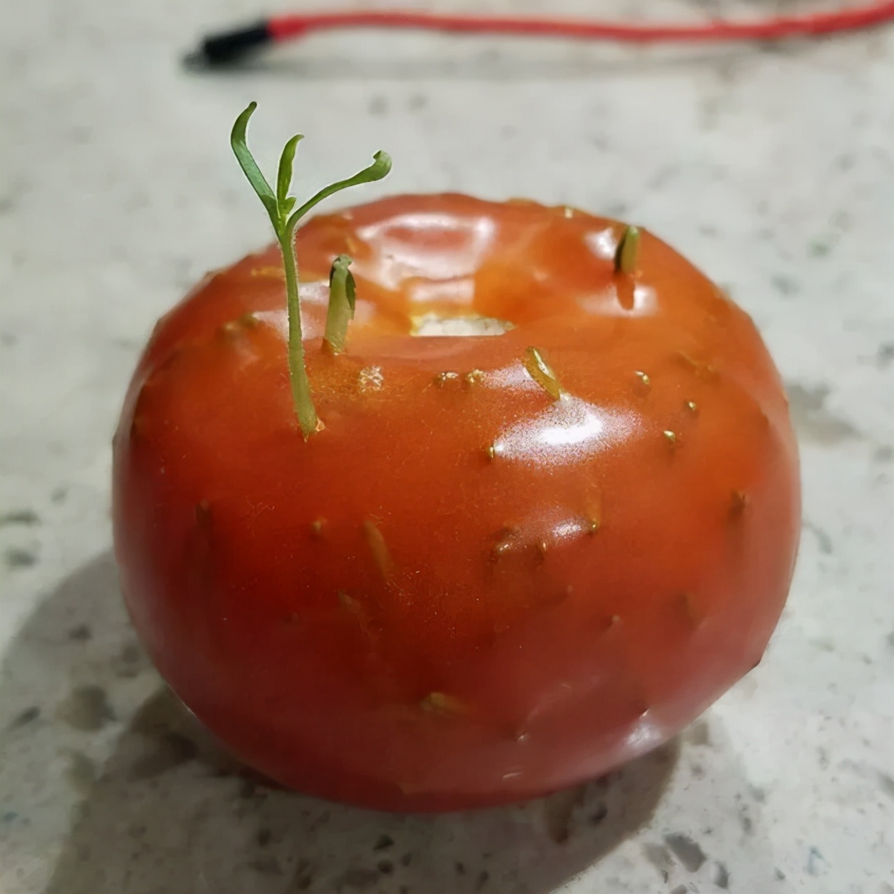 外表长芽的番茄,已经变得没有这么普通,不知道这些芽能否还可以长出另外一个番茄。