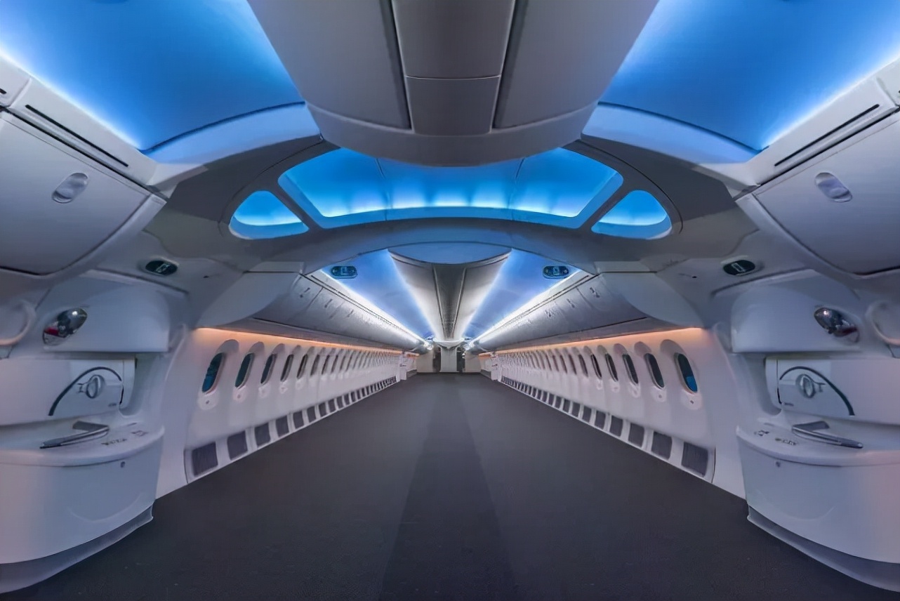 刚刚建造完成的波音747飞机还没有安装座椅,客舱中的场景十分梦幻,就像来到了外太空一样。