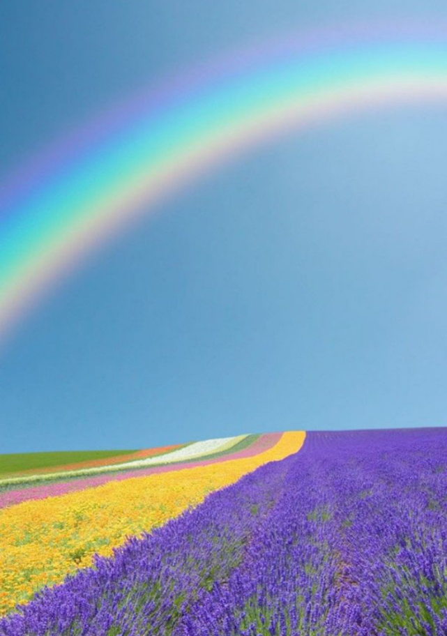 暴雨过后,天空中出现了彩虹,与土地中的花朵相照应,让人眼界大开。
