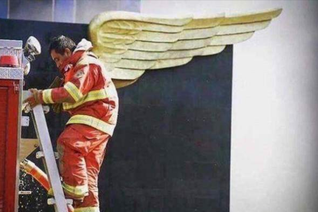 这张照片抓拍得非常好,消防员是每个人心目中保护自己的天使。