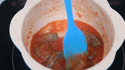 ▲步骤八:将猪肝煮至熟透,充分吸收番茄汁