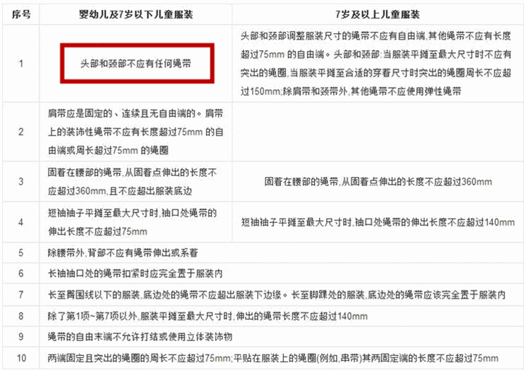 实际上,国家质量监督检验检疫总局和国家标准化管理委员会曾明确规定,七岁以下的儿童服装,头颈部不应有任何绳带,7岁以上的儿童产品,整体的绳带长度不能超过14厘米。