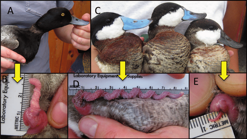 如果把范围扩大到哺乳类以外,丁丁的形式就更加丰富多彩了。藤壶的丁丁长度,能达到身长的8倍;有些豆娘的丁丁上有一个可膨胀的“气球”,气球表面还有尖角和硬毛;棕硬尾鸭(Oxyura jamaicensis)的丁丁不但长,而且扭成曲里拐弯的螺旋形。