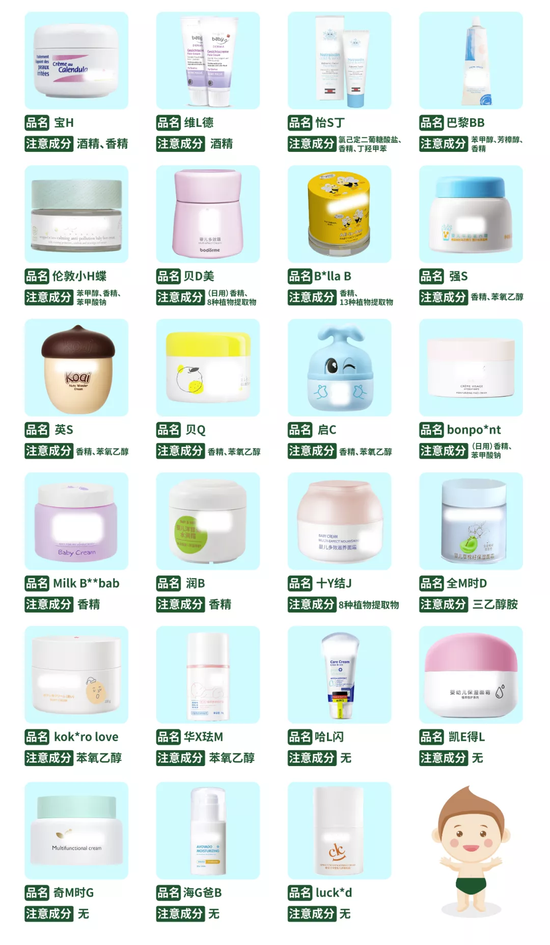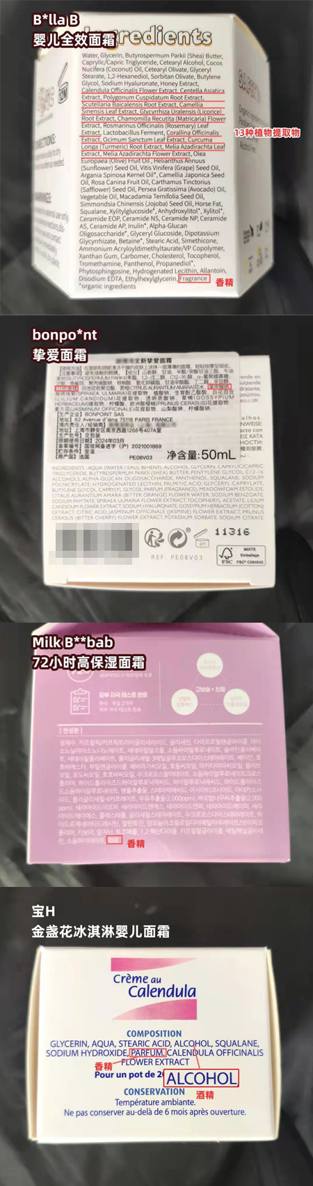 分析:苯氧乙醇、丁羟甲苯、苯甲酸钠、三乙醇胺,是面霜中比较常见的成分,虽然添加过量可能会让少数婴幼儿过敏,但从现有研究来看,这种概率极小。