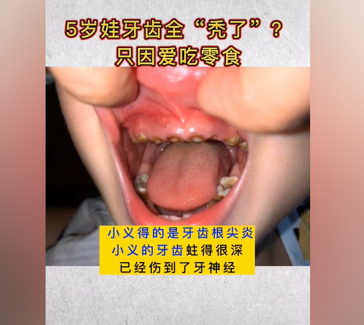 羊城晚报报道了一个5岁男孩小义去看牙齿的时候,牙齿几乎全部秃完了,像个老人家的牙齿一样,医生说得的是牙齿根尖炎,也就是孩子的牙齿蛀得太深了,已经伤到了牙神经。