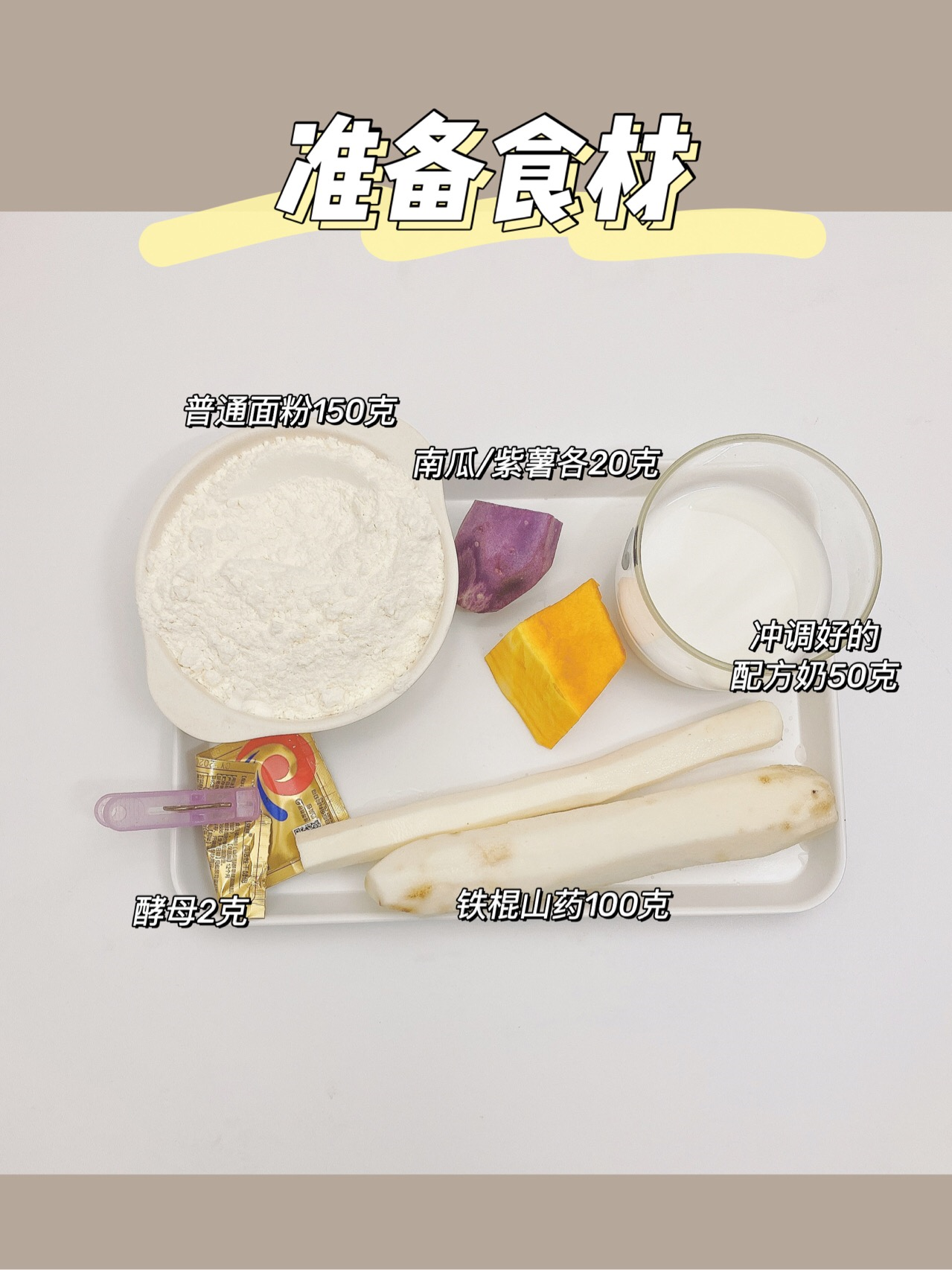 准备食材:普通面粉150克、配方奶50克、山药100克、酵母2克、南瓜紫薯各20克