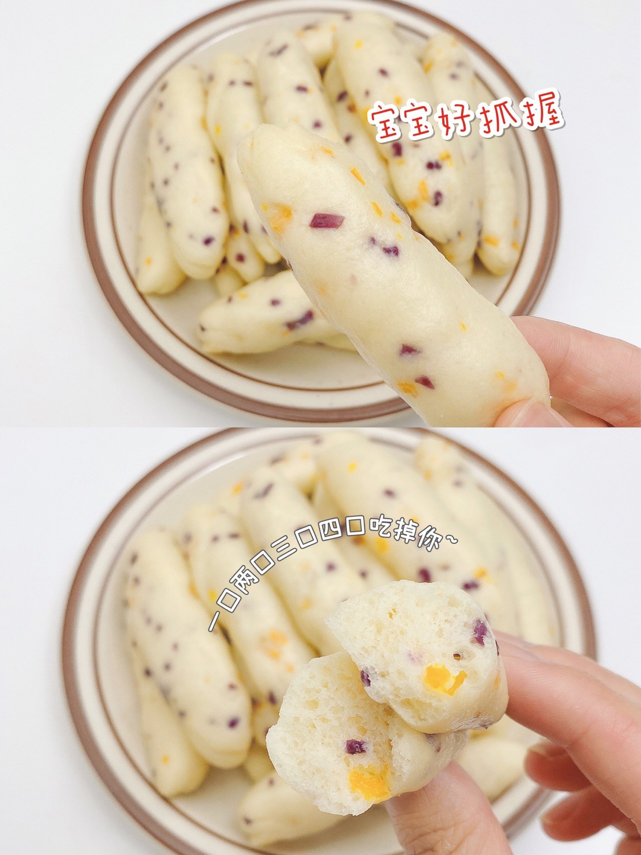形状非常适合锻炼宝宝抓握能力,而且松软香甜好咀嚼,没牙的宝宝也能吃!