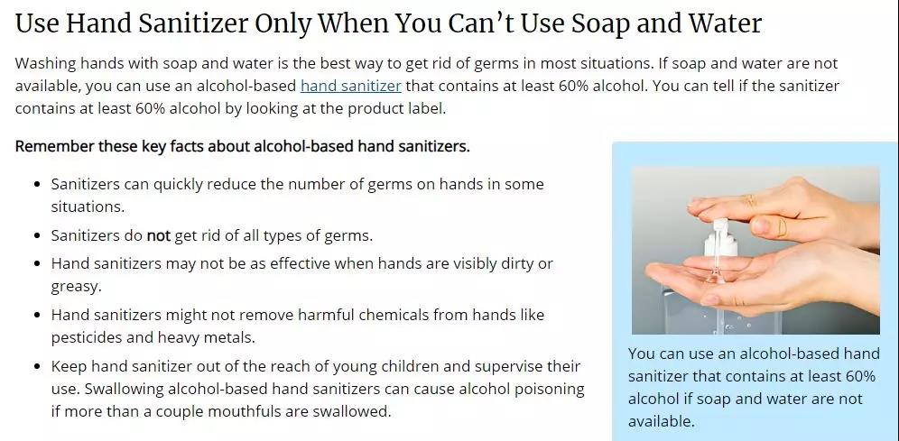 根据美国疾控中心(后称CDC)和美国食药监局FDA的建议,在这种缺少水源的情况下,最佳的替代方案是使用免洗洗手液。