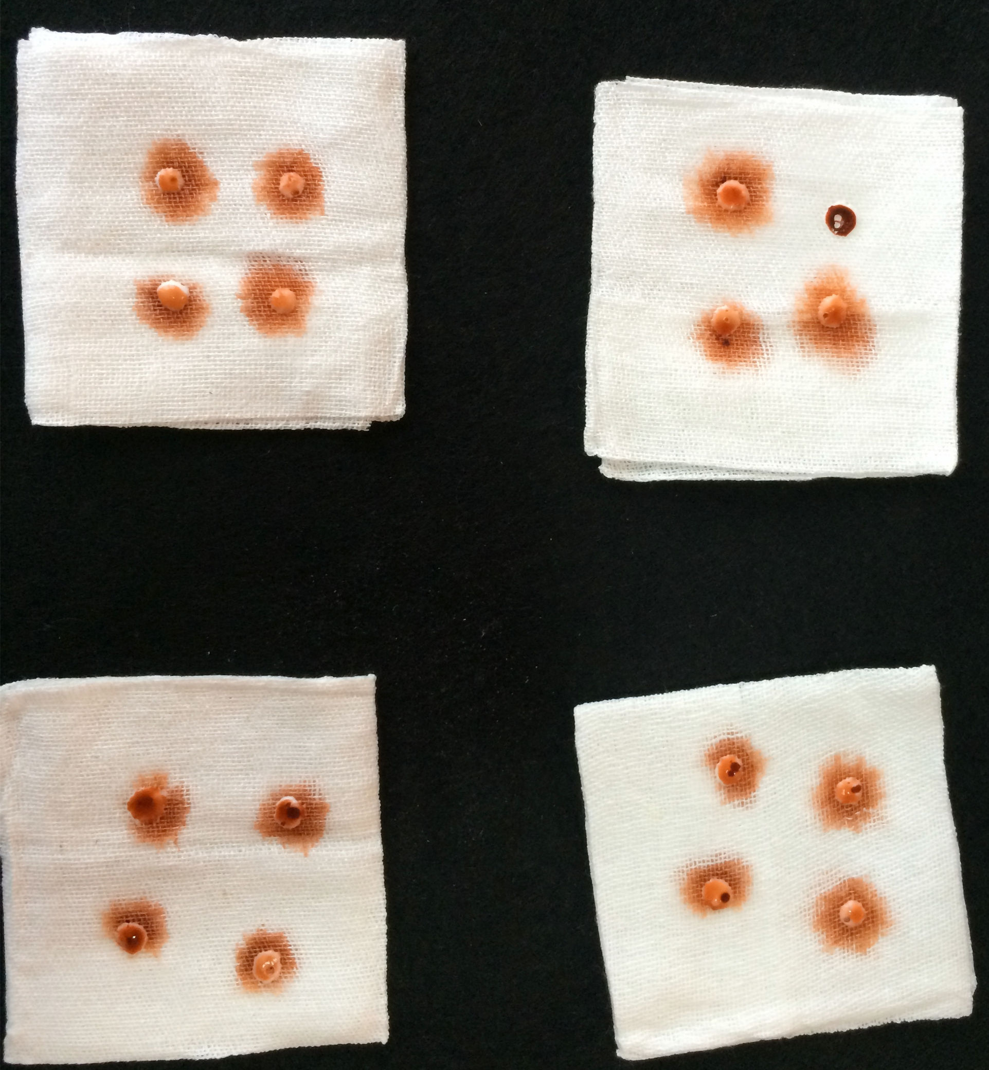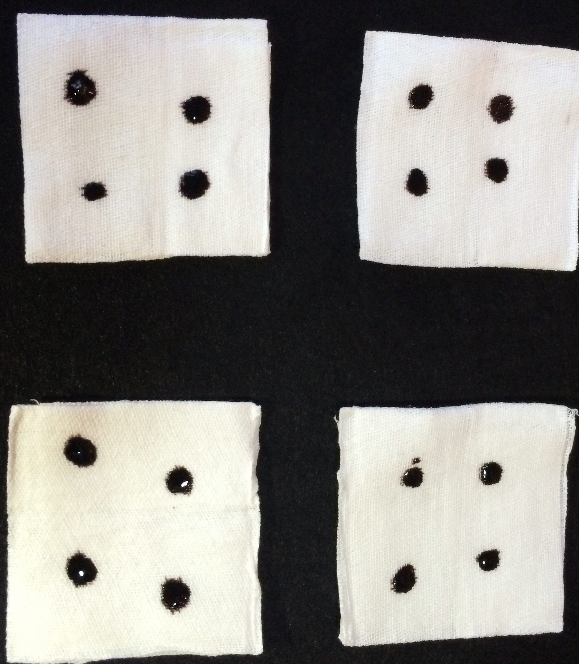 1.取四块白色纱布,滴上奶渍(为了显色又在奶渍上滴了相同的食用色素)或者酱油污渍。