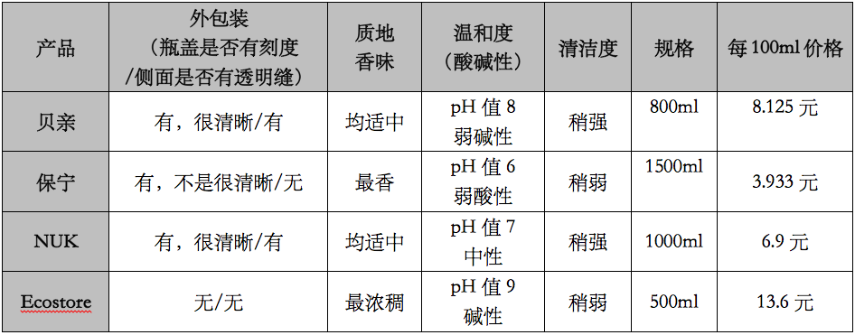 结论:从清洁力的角度来比较,贝亲=nuk>保宁= Ecostore