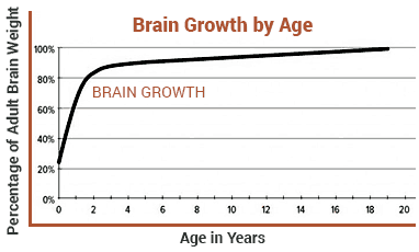 宝宝刚出生时,脑的重量仅有350~400克,大约是成人脑重的25%;到了1岁时,脑的重量达到出生时的两倍,达成人脑重的50%;2岁时,脑的重量达成年人脑重的80%;3岁时为成人脑重的85%,6岁时为成人脑重的95%,之后就趋于平缓。
