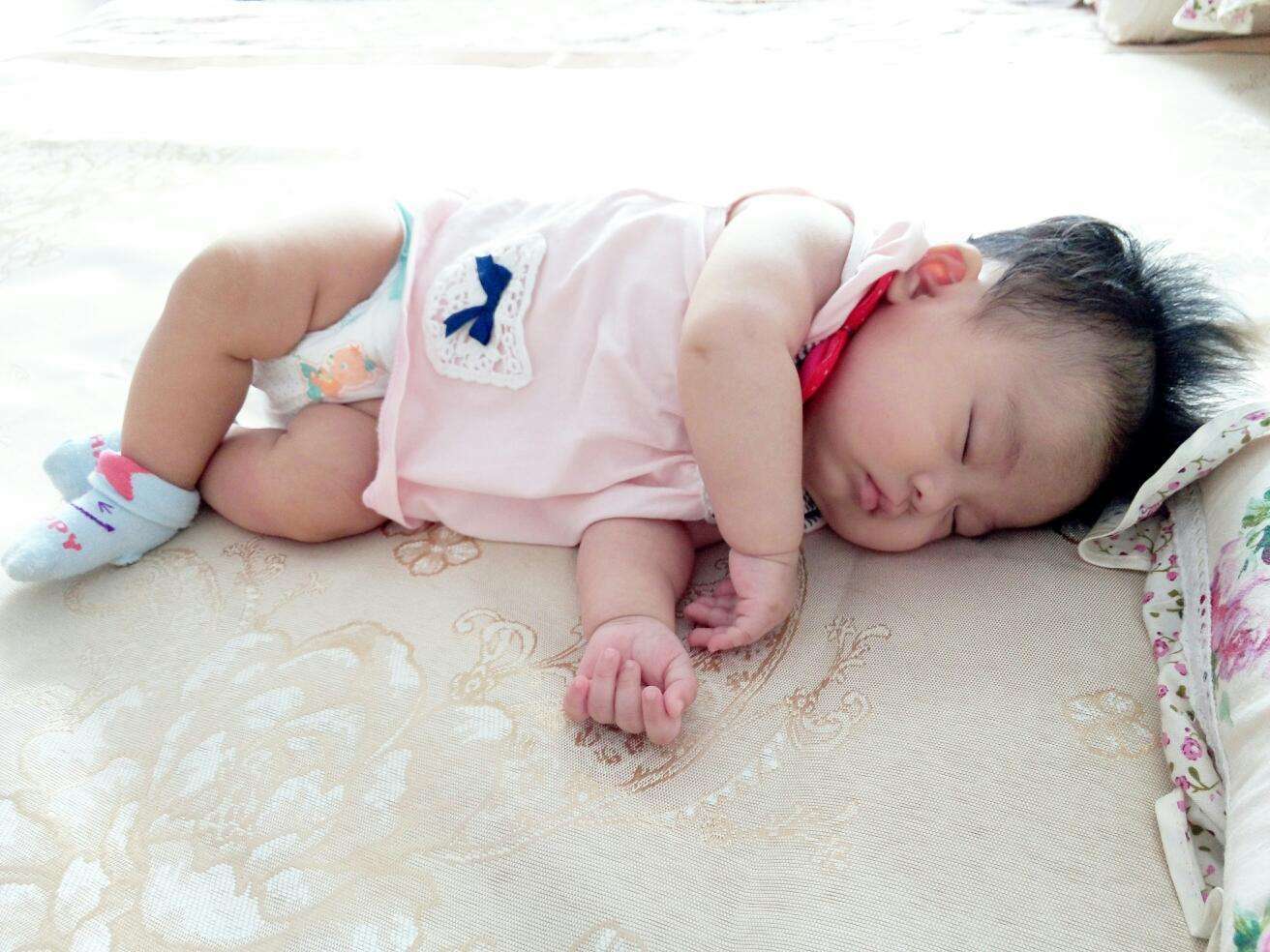 宝妈们给宝宝拍嗝之后别让宝宝平躺着,这样容易出现奶水回流的现象,可以选择侧卧的方式,让宝宝喝的奶“顺流而下”。
