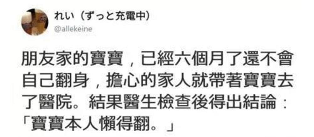 当然,每个宝宝的发育情况不同,并非说翻身翻得晚就是发育落后,曾经在网上看到个宝宝,都6个月还不会翻身,担心的家人就带着宝宝去了医院,结果医生的检查结果是:宝宝本人懒得翻!