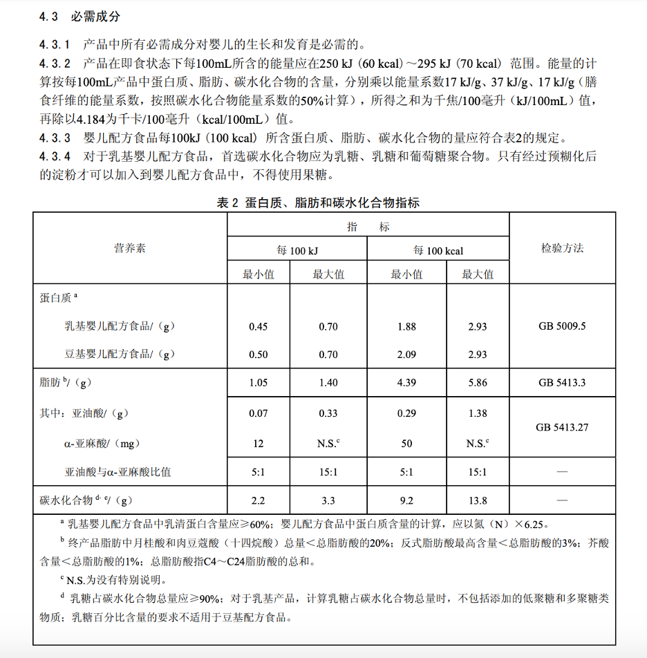 以下截图中对蛋白质、脂肪和碳水化合物指标的规定,适用于0-6月龄婴儿喝的配方奶,即1段婴儿配方奶粉。来自现行的《婴儿配方食品》(GB 10765—2010)。