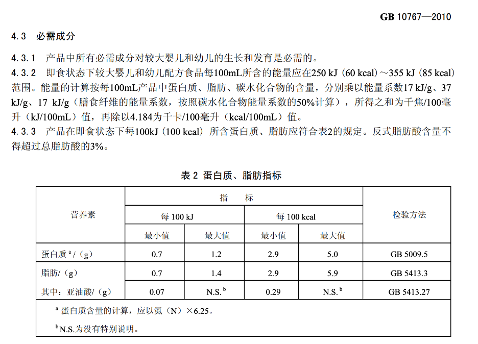 以下截图中对蛋白质和脂肪指标的规定,适用于6-36月龄较大婴儿和幼儿喝的配方奶,即2段和3段配方奶。来自现行的《较大婴儿和幼儿配方食品》(GB 10767-2010)