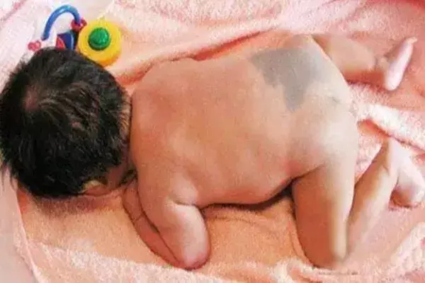 俗称“青屁股”,这是宝宝最常见的胎记,就是黑素细胞聚集形成的。