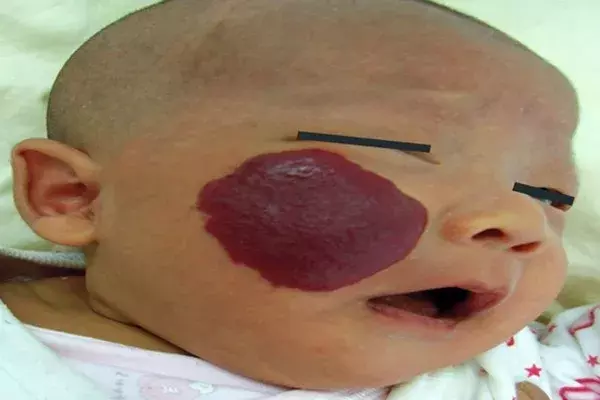 这是一种由膨胀的血管造成皮肤颜色变红或变紫的胎记。比较常出现的部位是面部、颈部。