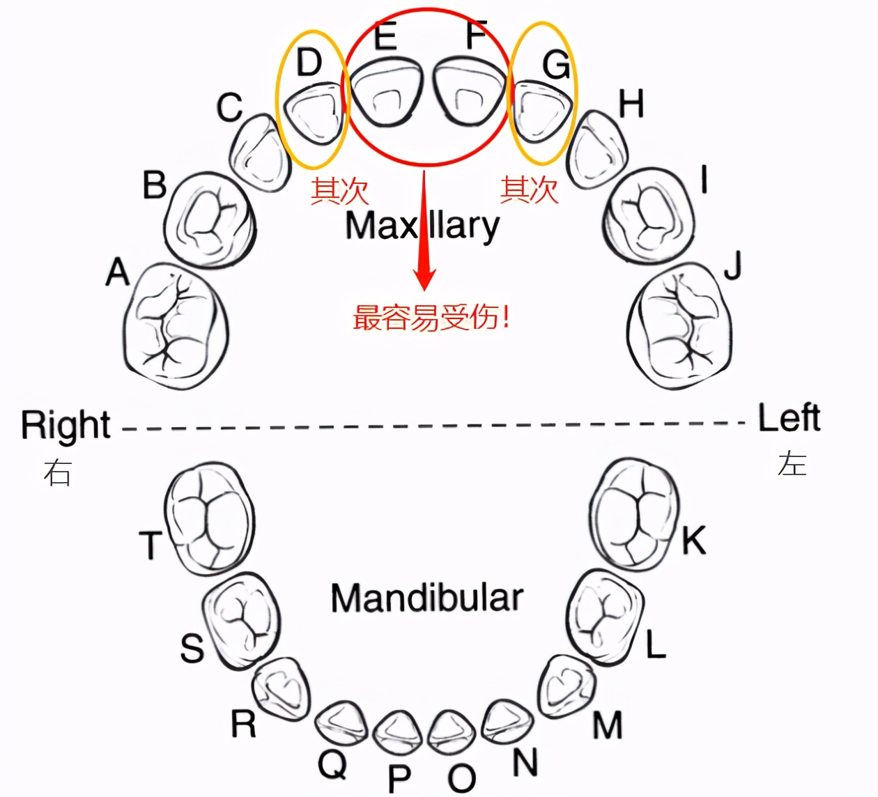 孩子们最容易摔伤的是上面两颗大门牙,其次是旁边两颗侧切牙。其他部位比较少见。