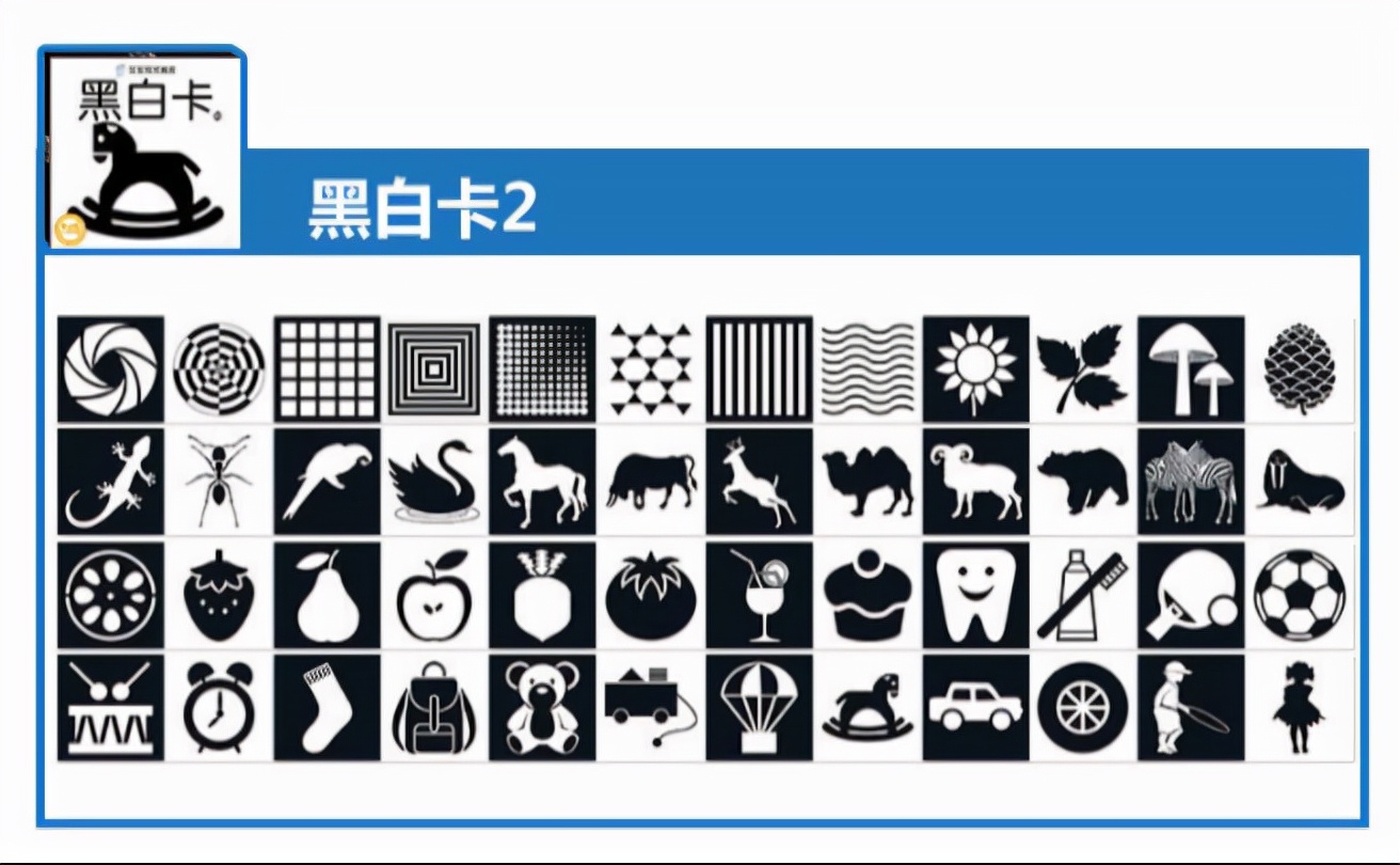 这个阶段宝宝对“靶心图像”比较敏感,刚开始看可以选类似靶心的黑白图卡、黑白相间的竖线、大方块等简单的几何图形;逐渐过渡到复杂、有曲线的图案,比如心形、波浪线、棋盘形黑白格子等。