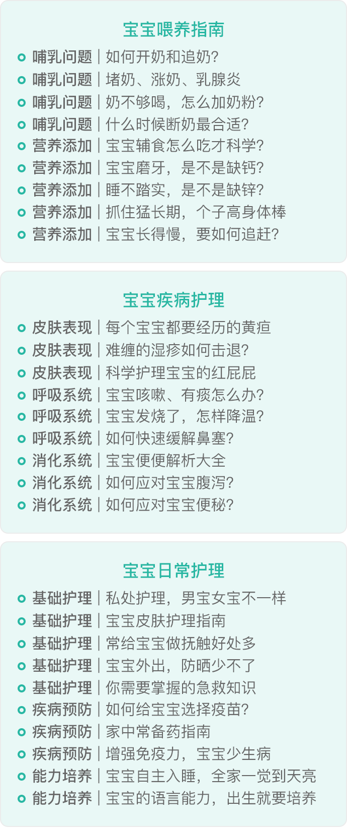 哺乳问题、营养添加、皮肤问题、呼吸消化系统疾病、基础护理、疾病预防以及能力培养等8大系列课程知识,每天解决一个育儿难题,适合每一个中国家庭。
