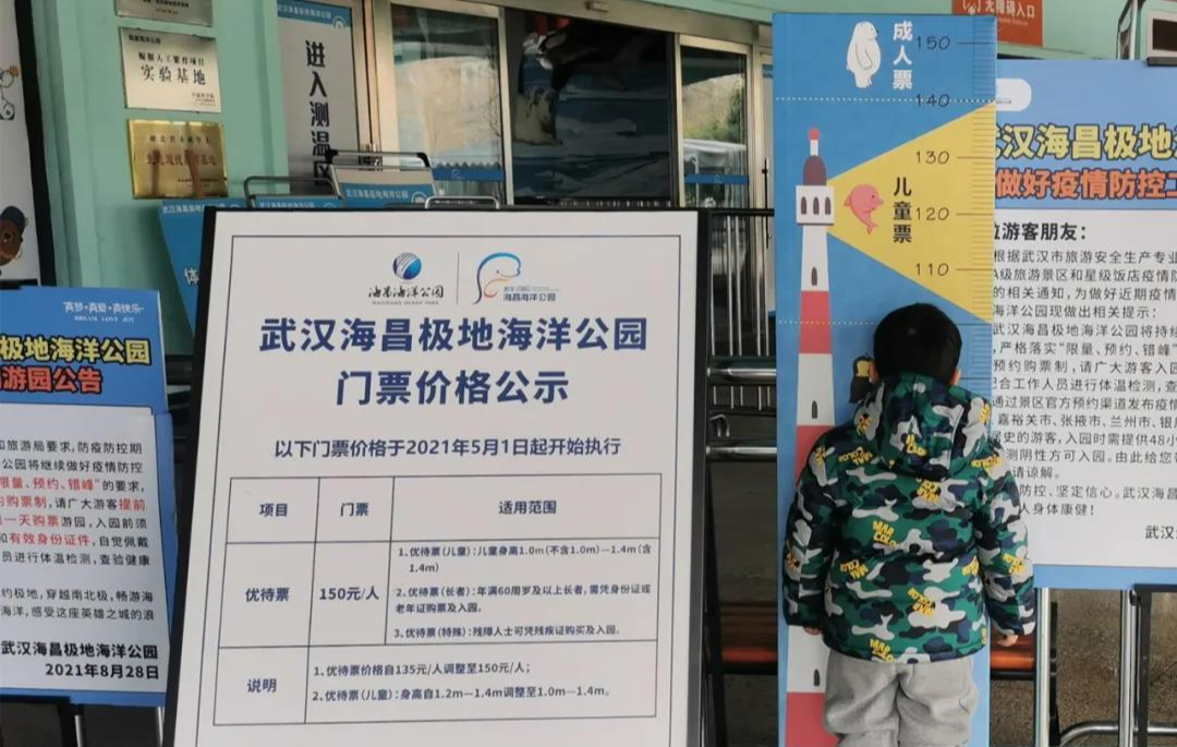 海昌极地海洋公园售票处外,设置有门票价格公示和身高测量台。公示显示,景区全价票为240元每人,1米以下儿童免票,1至1.4米儿童可购买优待票,票价为150元每人。现场工作人员介绍,价格为景区自行制定,报物价部门核准后执行。