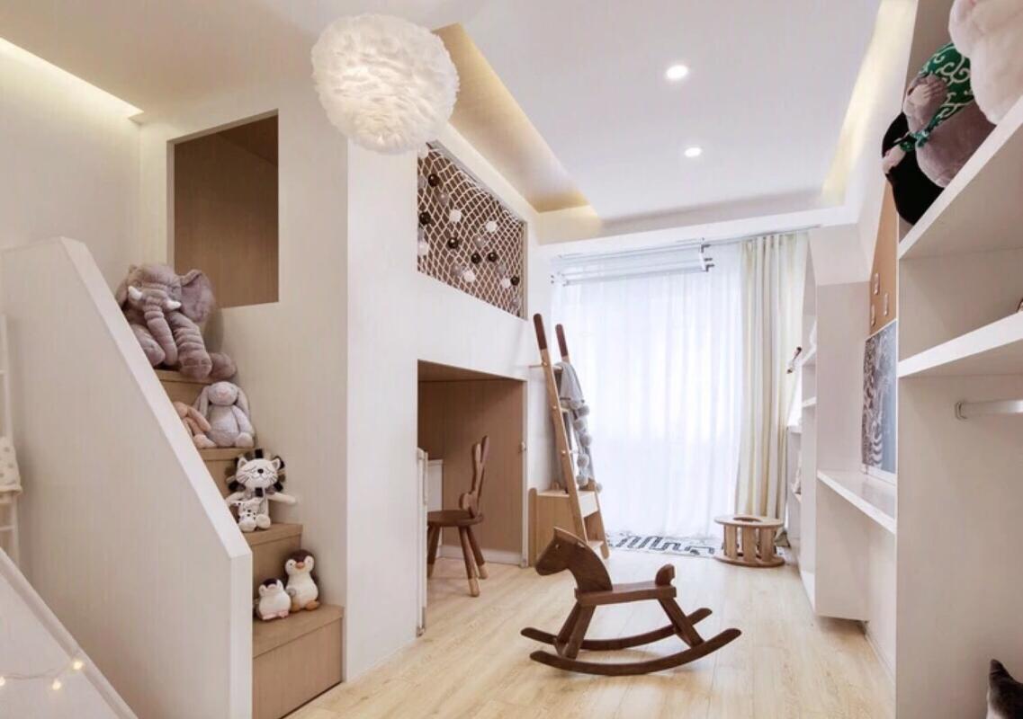 这个房间内堆满了各式各样的玩具,房间里的颜色也被装饰得格外绚丽,一个儿童玩具小木马就停放在房子的中间。