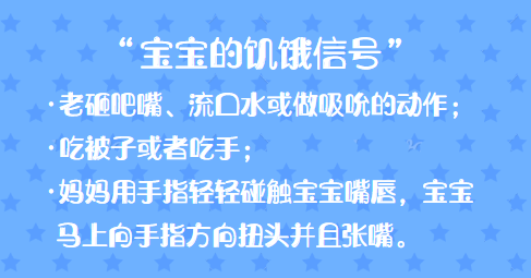 另外,了解“宝宝的饥饿信号”,是进行按需哺乳的前提,如果宝宝有这些表现,一般都说明宝宝是饿了,这时候是可以给宝宝喂奶的: