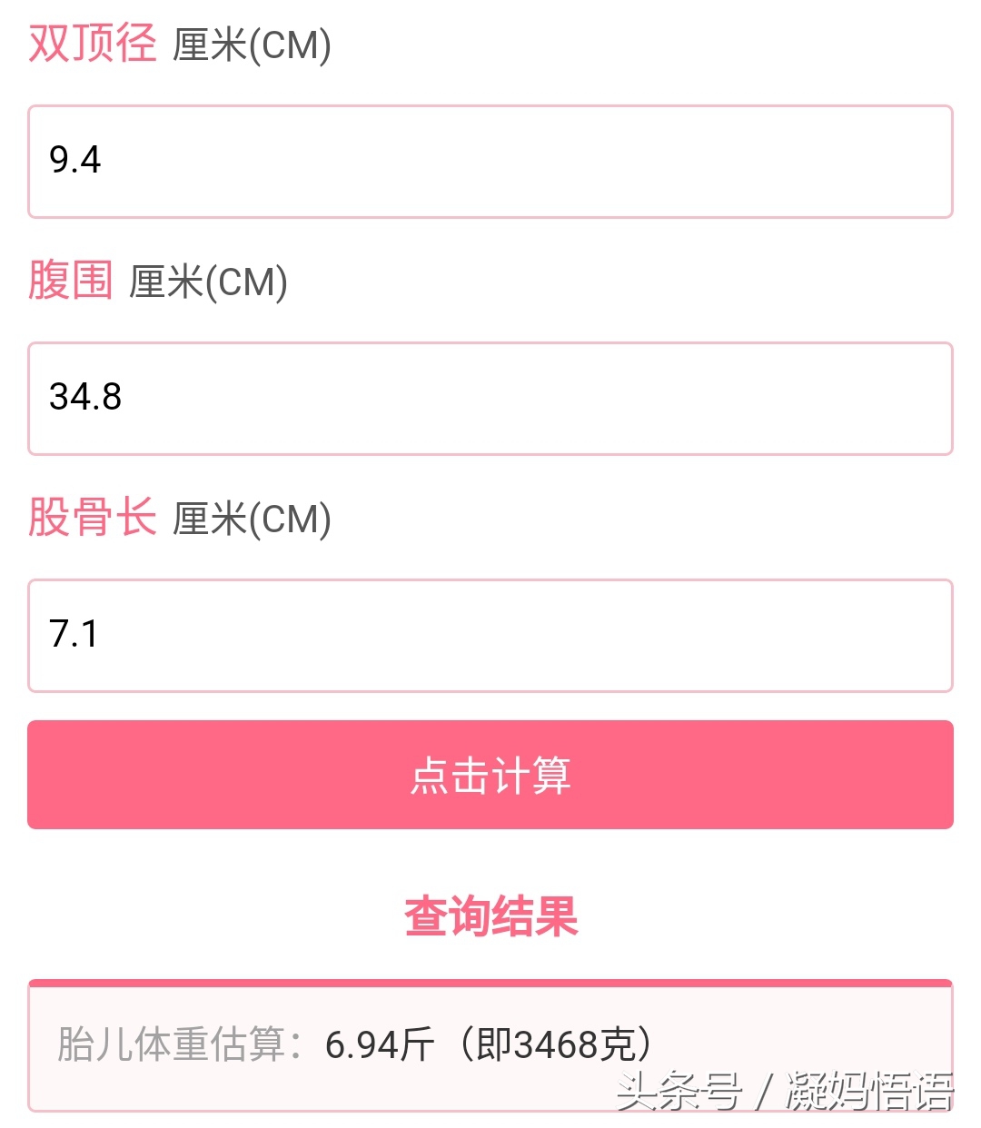 将这些数据输入计算器,得出的胎儿体重是3468g,与B超单上给的数据3402g差距66g,非常准确。