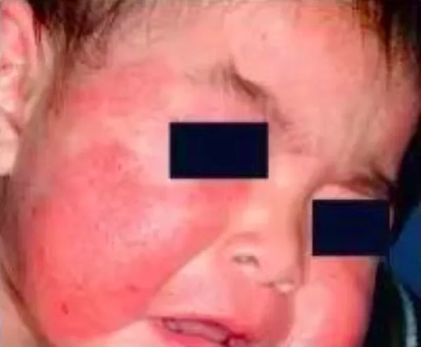 如上图所示,湿疹常在面部,且呈对称分布,而且是一片一片的