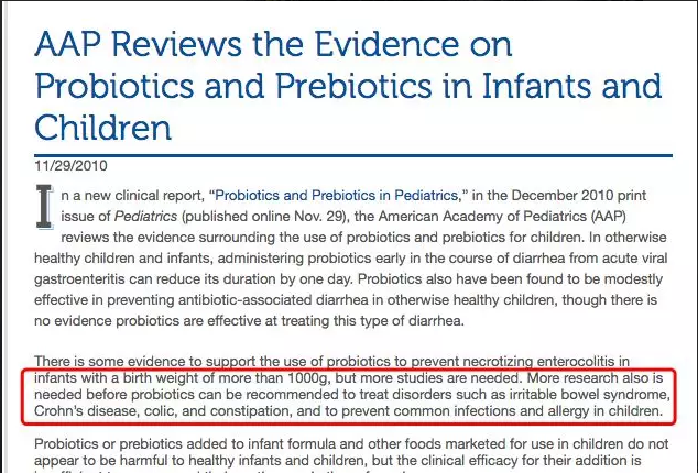 对于功效,2010年,美国儿科学会曾发布一篇关于婴幼儿使用益生菌的文章,表示还有待研究。