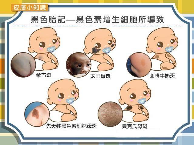多数有这种黑色素痣的孩子,是在出生的时候就有的,表现为多处大片褐色或者黑色的斑块,有时甚至还会遮盖整个躯干。这时候就应该考虑是不是有神经-皮肤黑变病(NCM)的可能。